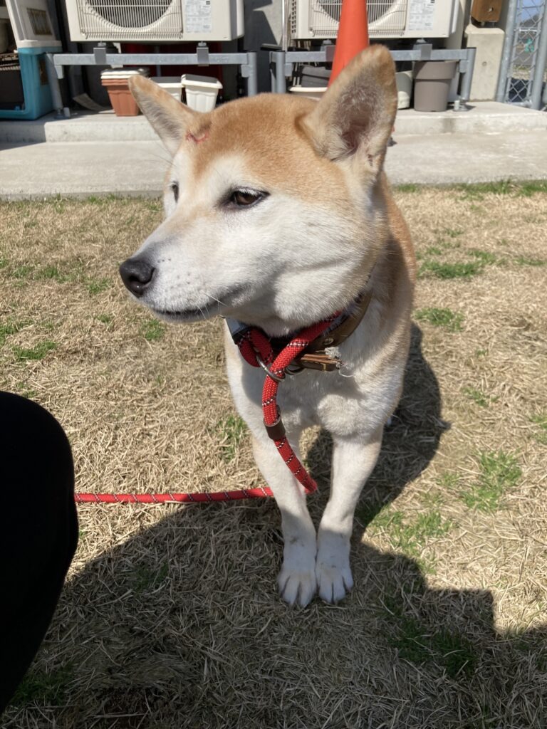 首輪とバンダナを付けたとても人懐こい成犬を保護しています!